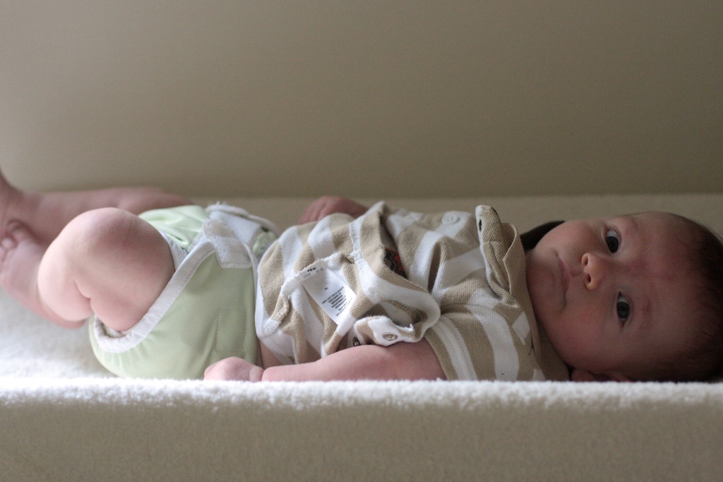 We started Jack in cloth after his first week home from the hospital. He was tiny and the diapers barely fit, but they worked somewhat well. Unfortunately, he developed a diaper rash that refused to go away until we put him in disposables. I think his skin was very sensitive, being that young, and, also, we both had a case of thrush. We needed to keep his bum super dry, so he was in disposables for a few weeks.